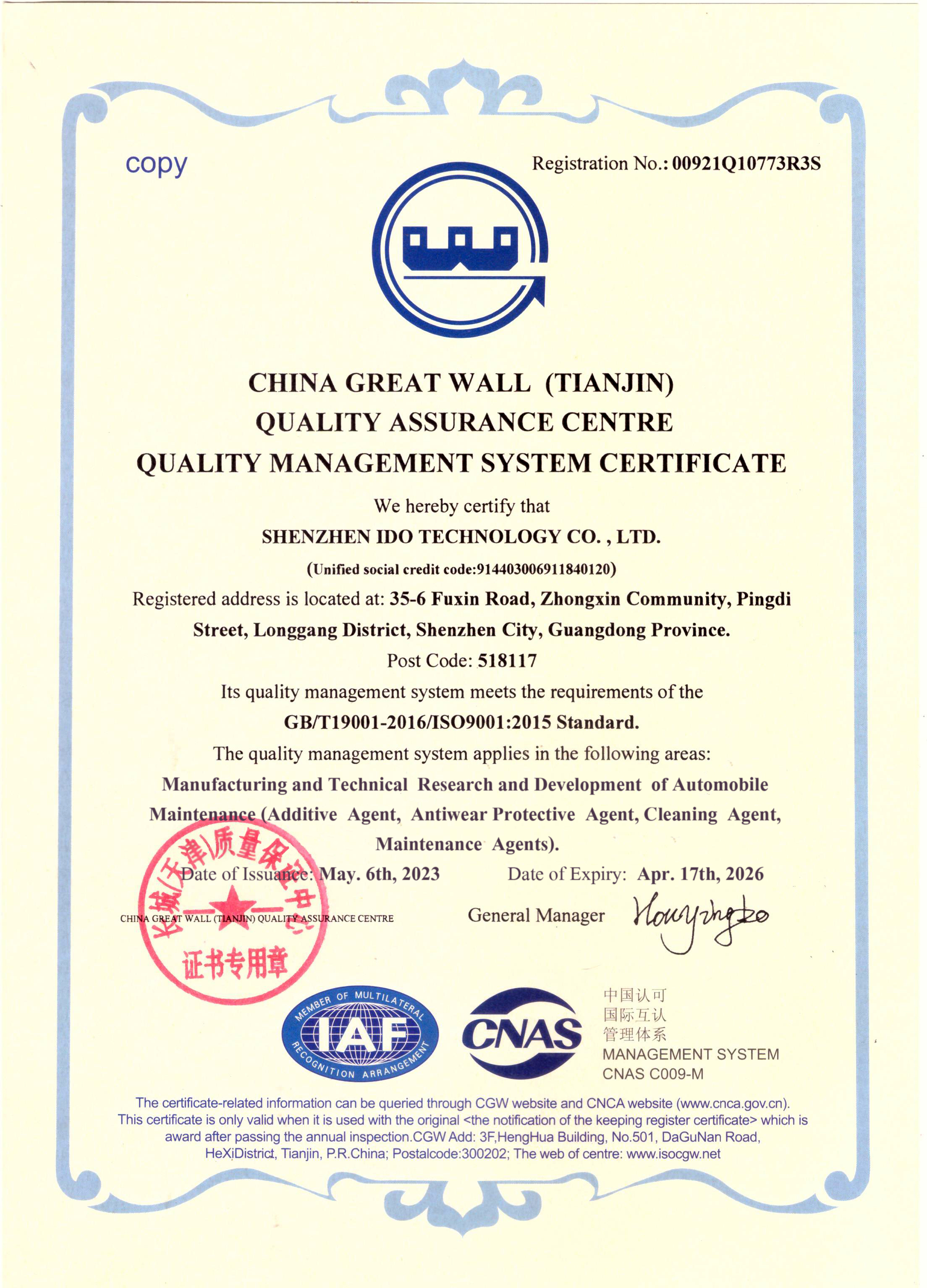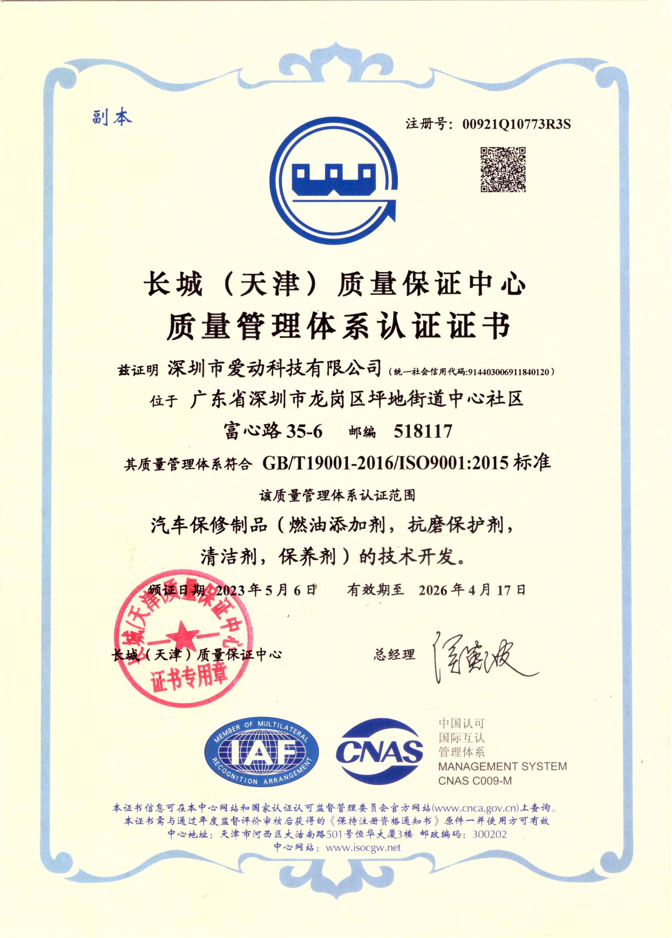 ISO9001企业质量管理体系认证书(英文)